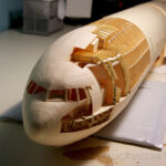 Relying on detailed schematics of an Air India 777-300ER he found online, he recreates the digital drawings in Adobe Illustrator and then prints them directly onto the paper manilla folders. But everything has to be perfect. So perfect, that Laconi-Stewart says he’s actually built two airplanes, the one you see here and the numerous failed attempts including three tails, two entire sets of wings, and multiple experiments to ensure everything is just so.