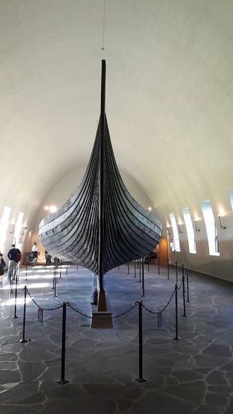 Die erste Haltestelle ist das Wikingerboot-Museum. Im Gegensatz zum Schiff hält der Bus in direkter Nähe. Das Gebäude erinnert in seiner Auslegung in Kreuzform mit Längs- und Querschiff an einen Sakralbau. Der Parkplatz vor dem Museum ist gut besetzt mit Reisebussen, was lange Warteschlangen erwarten lässt. Doch weit gefehlt. Mit der wunderbaren Oslo-Card schieben wir uns an den an der Kasse anstehenden vorbei und vor unseren Augen entfaltet sich die ganze Pracht. Denn nicht nur ein, sondern gar zahlreiche Langboote, oder zumindest deren Rümpfe, zeigen sich dem interessierten Besucher.