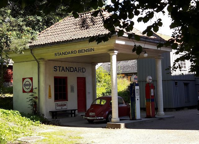 Stellvertretend hierfür die mittelalterliche Stabskirche Gol, die 1884 am ursprünglichen Standort abgetragen und hier im Freilichtmuseum wieder aufgebaut wurde. Daneben eine Tankstelle, die früher einmal am Nordstrand beheimatet war. Das ganze Freilichtmuseum ist prinzipiell ein großes Dorf, zusammengesetzt aus den unterschiedlichsten Epochen. Echt sehenswert und nicht nur besucht, weil es im Ticketpreis der Oslo-Card enthalten war. Diese hat sich spätestens jetzt voll amortisiert, sind wir doch überall ohne Wartezeit an den Kassen vorbeigekommen.
